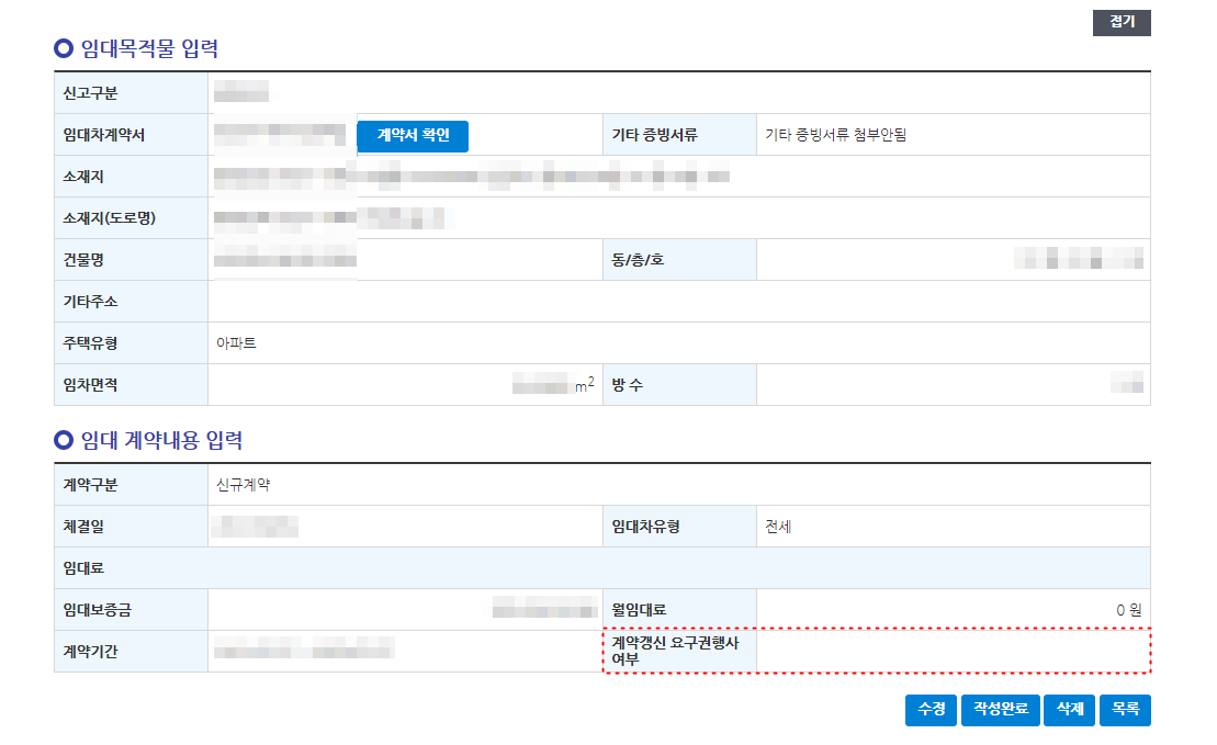 확인하다보니 임대계약내용 입력 항목에 계약갱신 요구권 행사여부가 보이더라구요