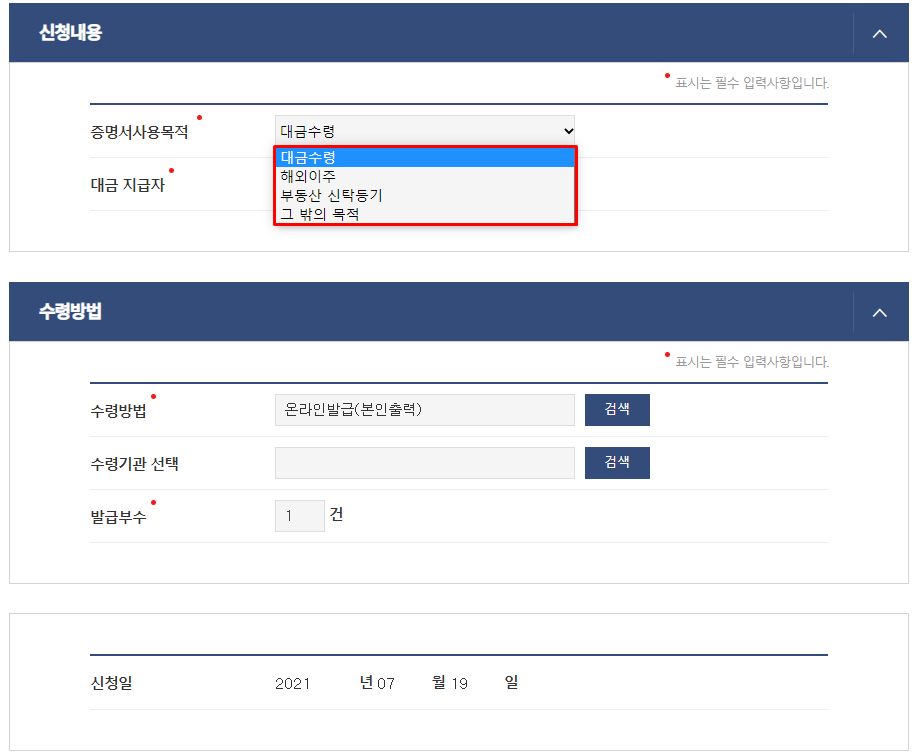 증명서사용목적에 맞는 항목을 선택하고 입력합니다.