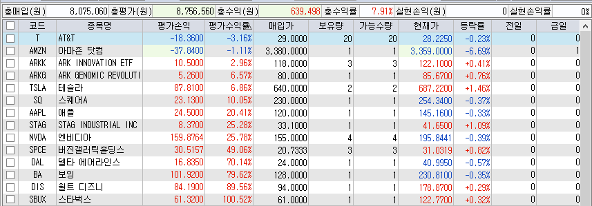 아마존은 1주당 가격이 큰편이라 -37$이지만 수익률은 -1.11%