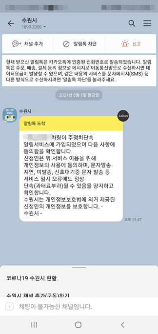 용인과 화성은 SMS문자가 수원에서는 카카오톡으로 안내해주네요