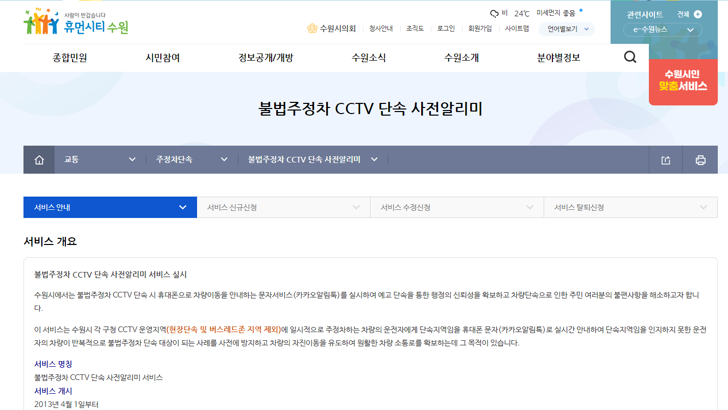 휴먼시티 수원시청 홈페이지 - 교통 - 주정차단속 - 불법주정차 CCTV 단속 사전알리미 에서