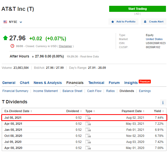 인베스팅닷컴과 디비던드닷컴에서 배당(Dividend) 관련 내용을 살펴보니