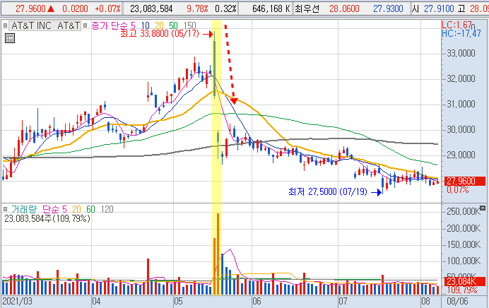 하지만, 지난 5월 디스커버리 인수 발표로 급등하였지만 곧바로 배당 삭감 소식을 전하면서
