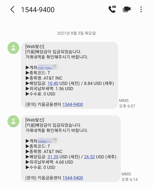 지난주 수요일 AT&T의 배당금 입금 알림에