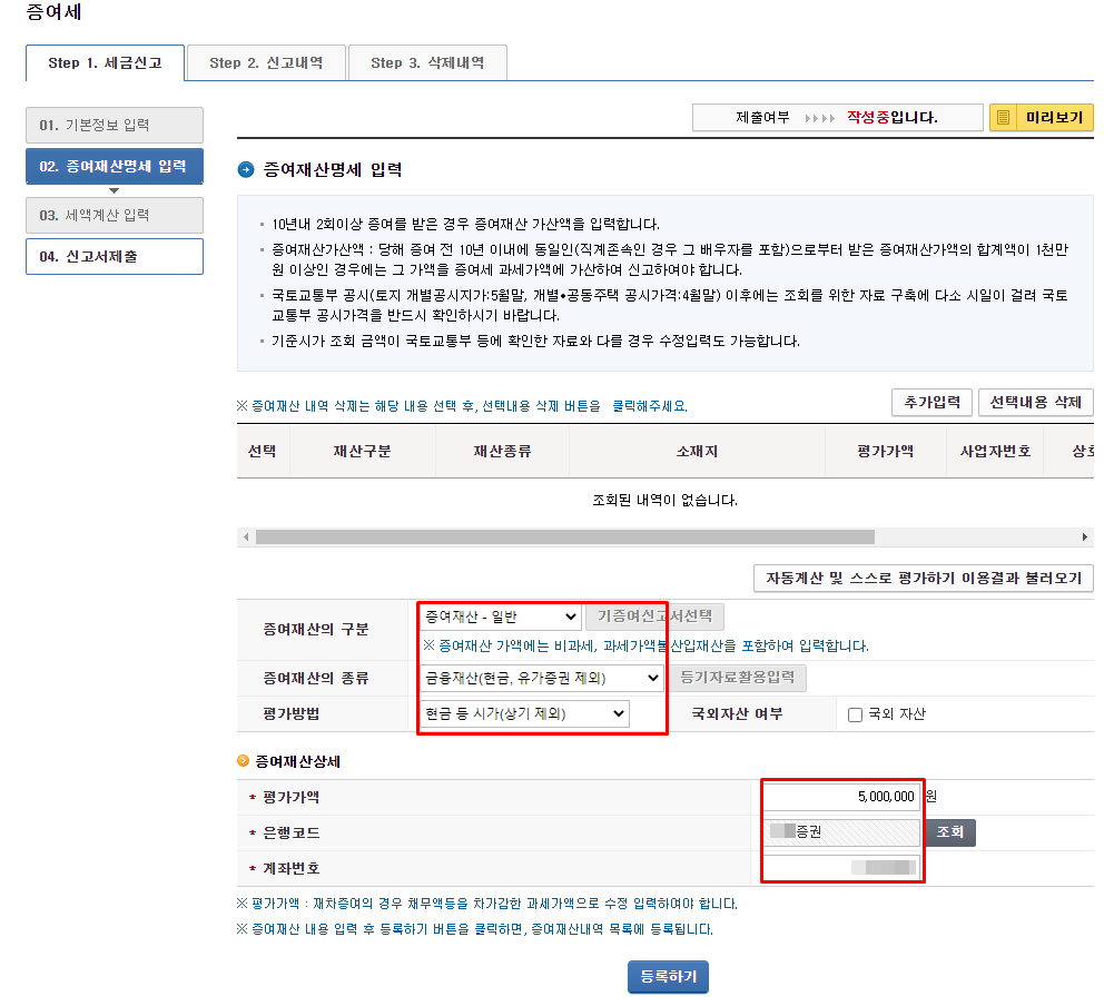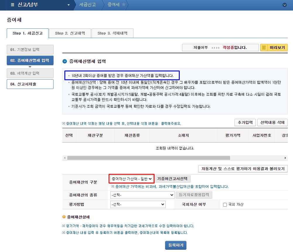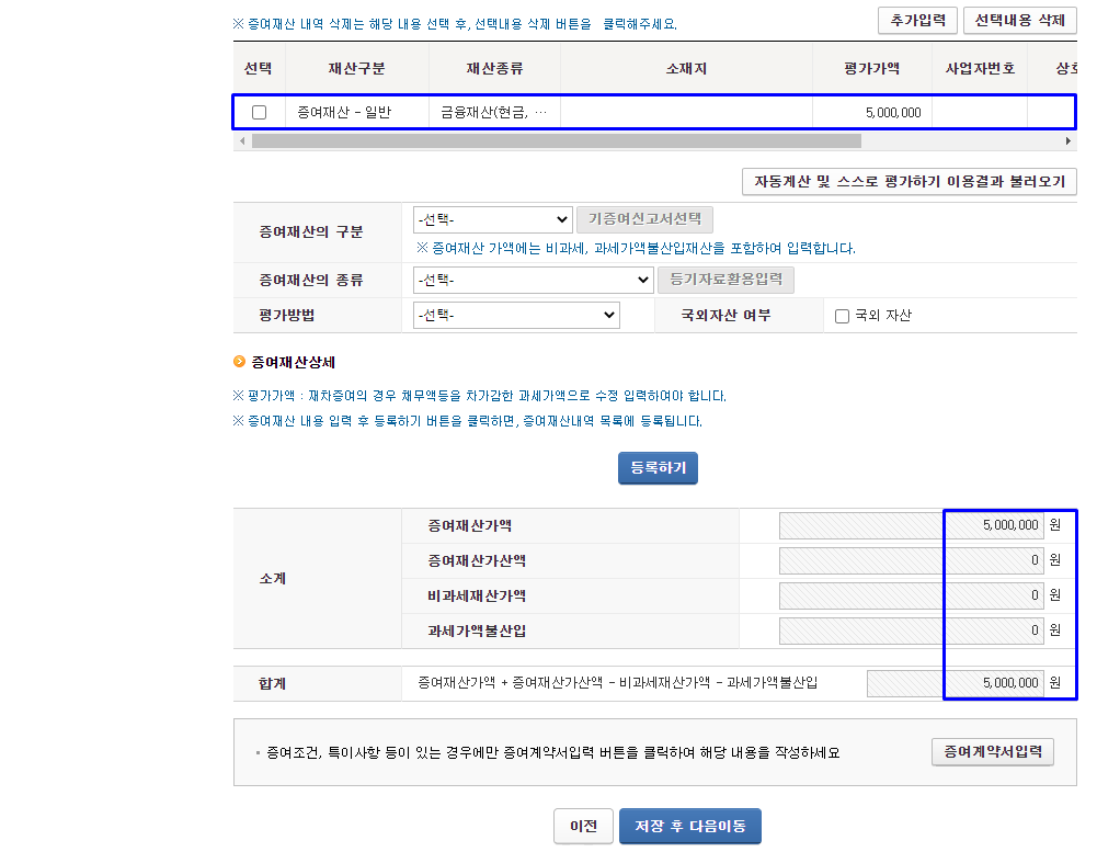 증여정보를 입력하고 등록하면 증여재산 내역(파란색표기)에