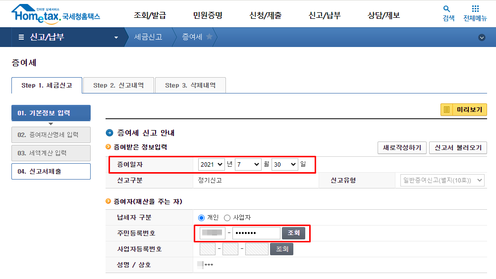 Step 1. 세금신고 : 01. 미성년자 증여신고 - 기본정보입력