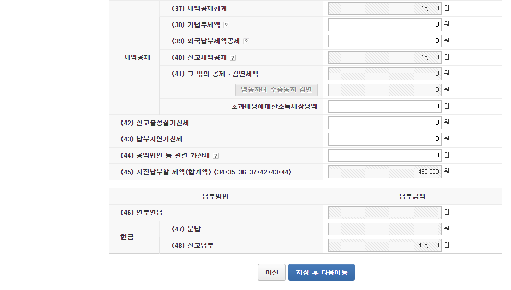 증여재산 공제에 미입력 화면 : 세금 48만5천원
