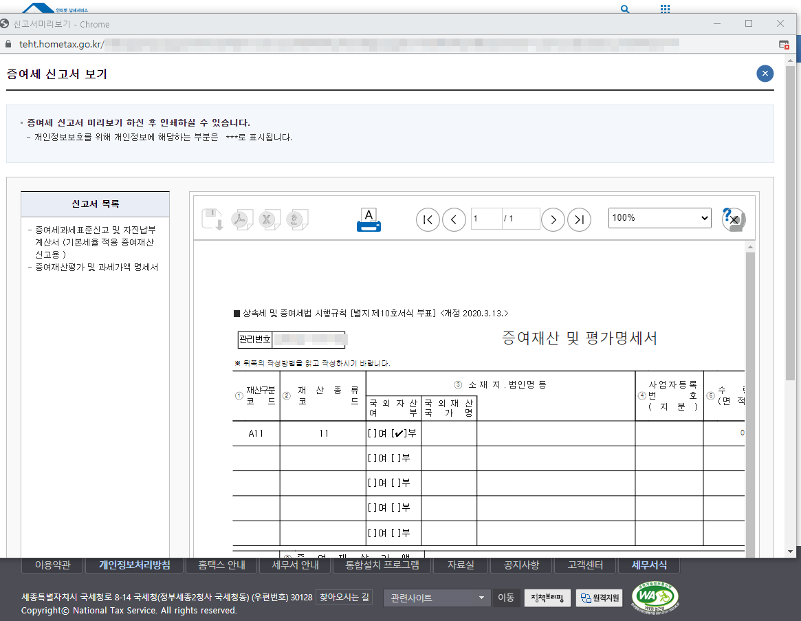 증여재산평가 및 과세가액 명세스를 확인할수 있습니다.