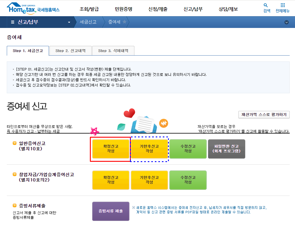 일반 증여신고의 경우 확정신고/기간후 신고는