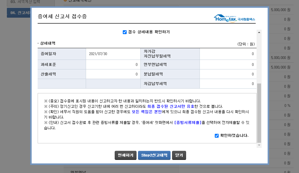 작성한 신고서, 납부서, 제출된 첨부서류 확인 안내를 확인합니다.
