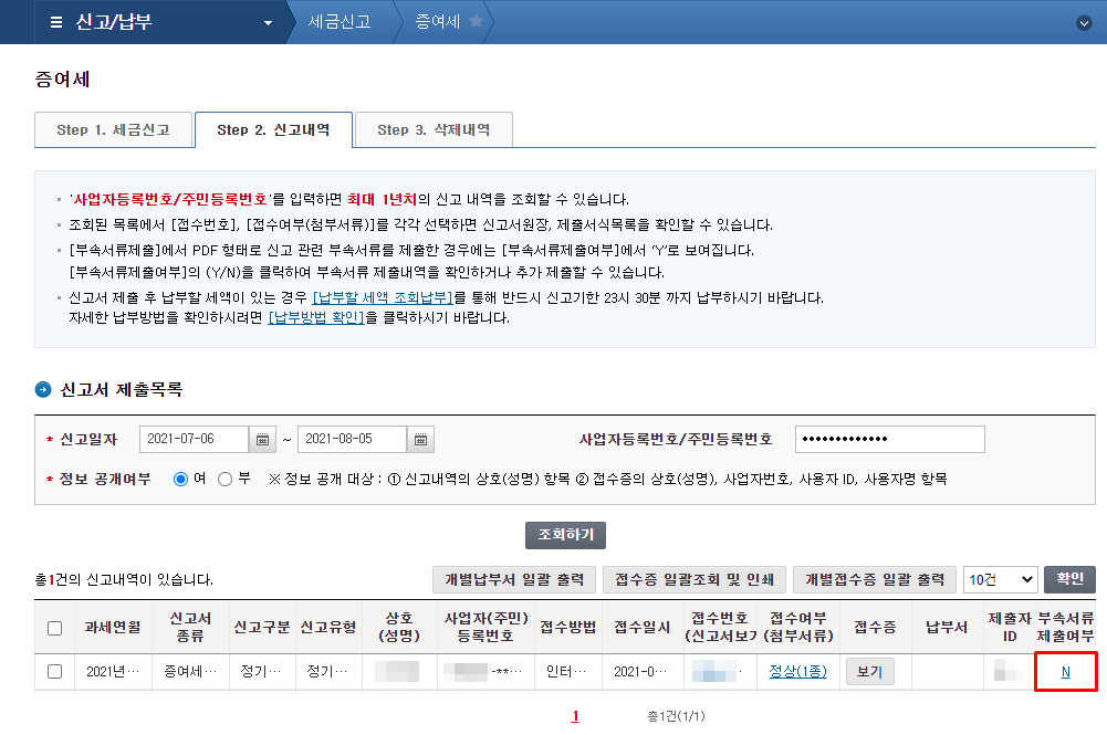 서류 제출완료후 신고내역에서 부속서류 제출이 Y로 변경된것을 확인할수 있습니다.