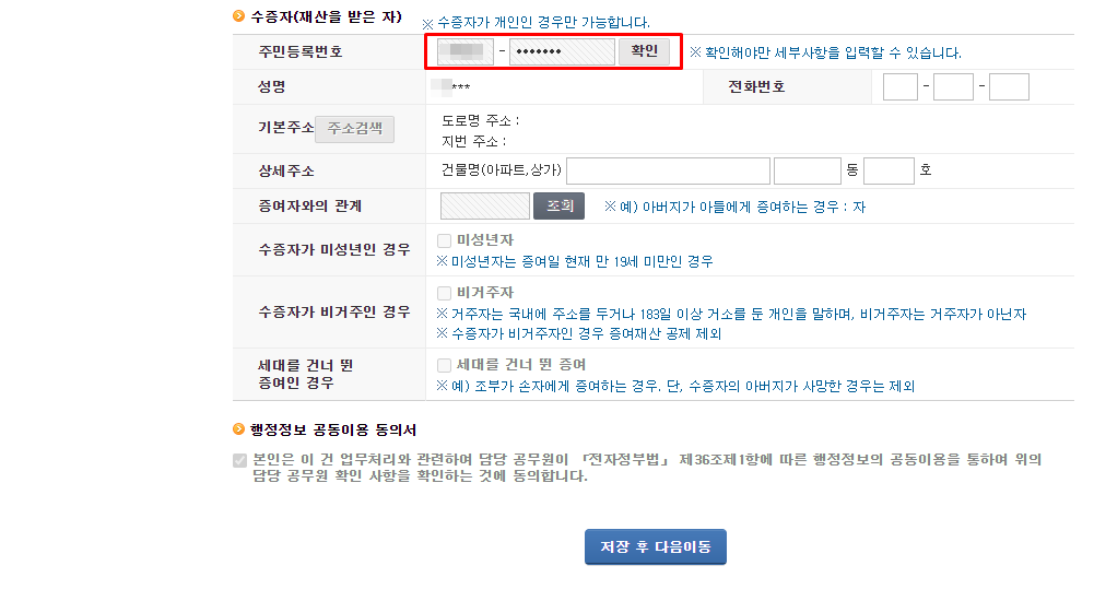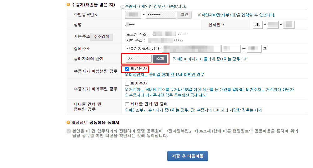 다음은 수증자, 돈을 받는 아이의 정보를 입력하는 부분입니다.