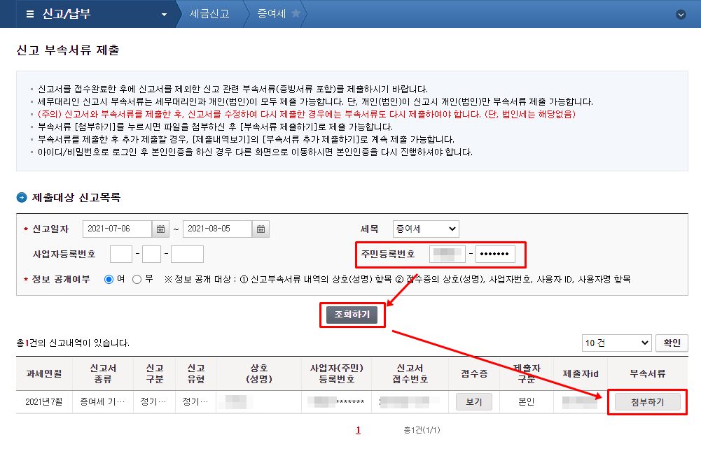 부속서류 첨부를 위하여 신고내역에서 제출한 내역을 조회합니다.