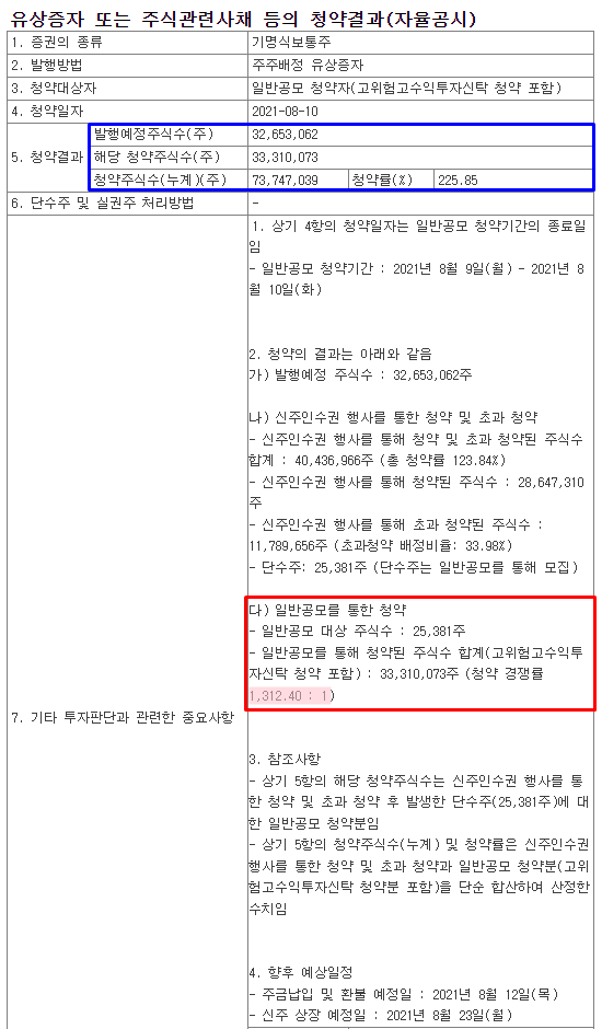 청약 주식 누적 7300만주로 r7 청약율은 225.85의 결과였어요