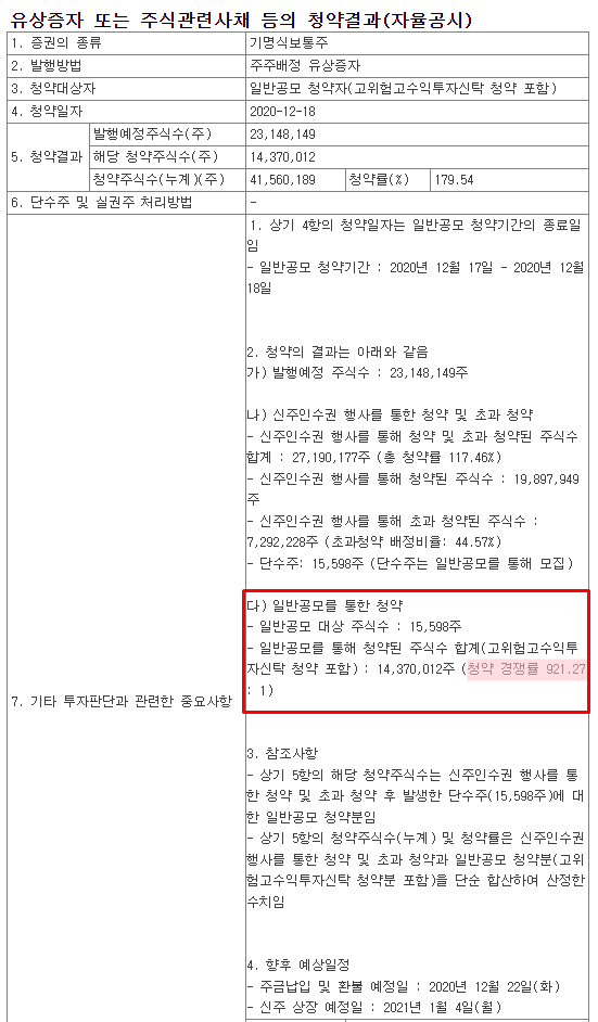 작년 12월에 진행한 일반공모 단수주 청약율 921.27:1이었는데