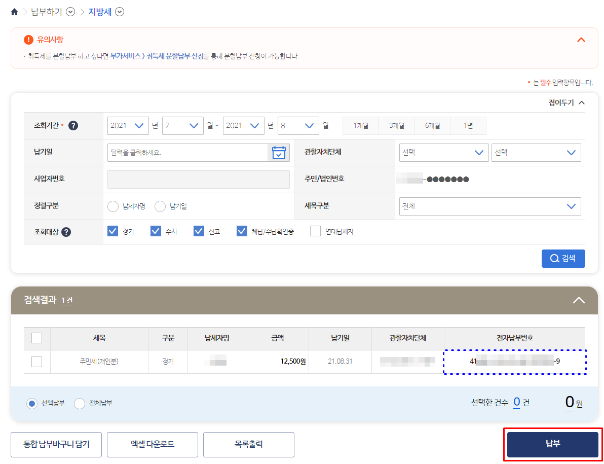 납부결과 메뉴에서 지방세로 조회가 가능하며