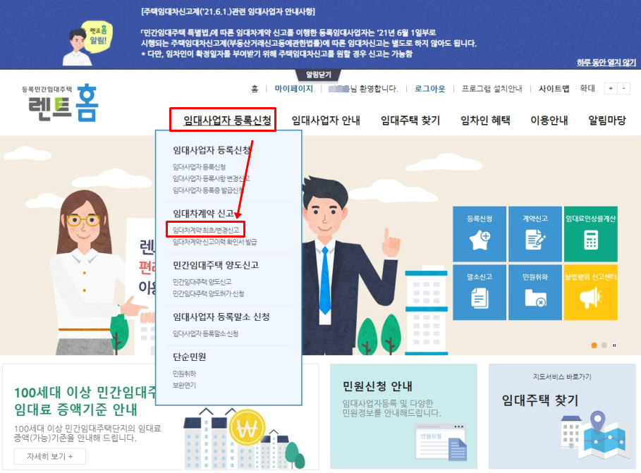 "임대사업자등록신청 → 임대계약최초/변경신고"로 이동 합니다.