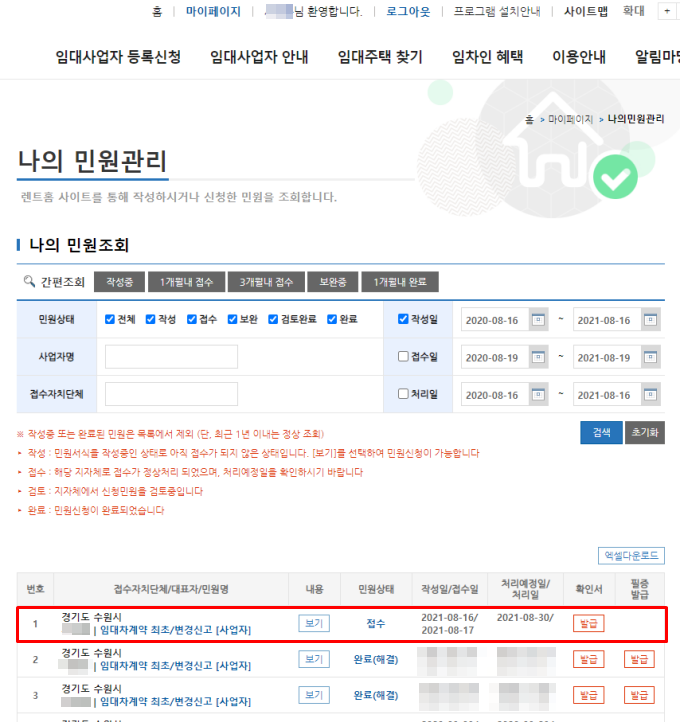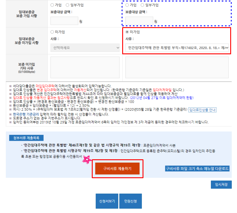 신청서 작성과 표준임대차계약서 첨부가 완료되었다면