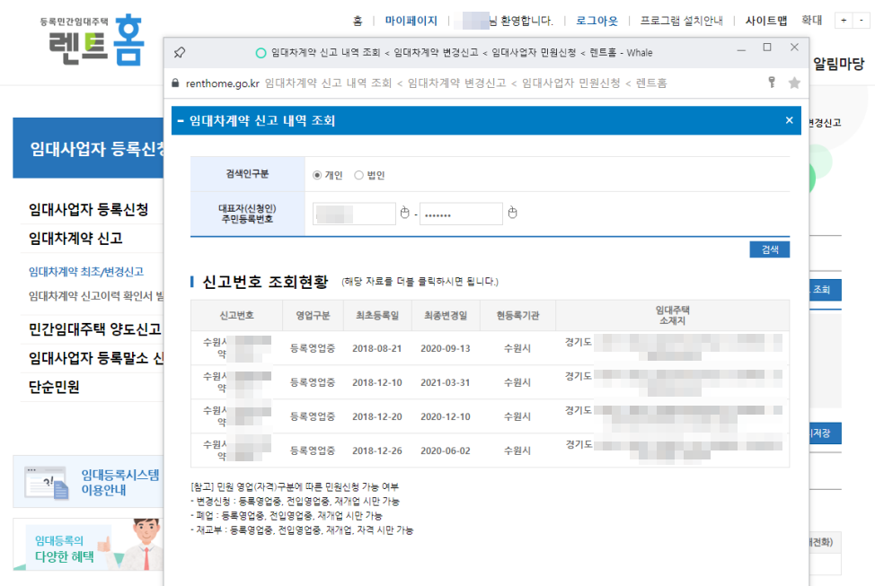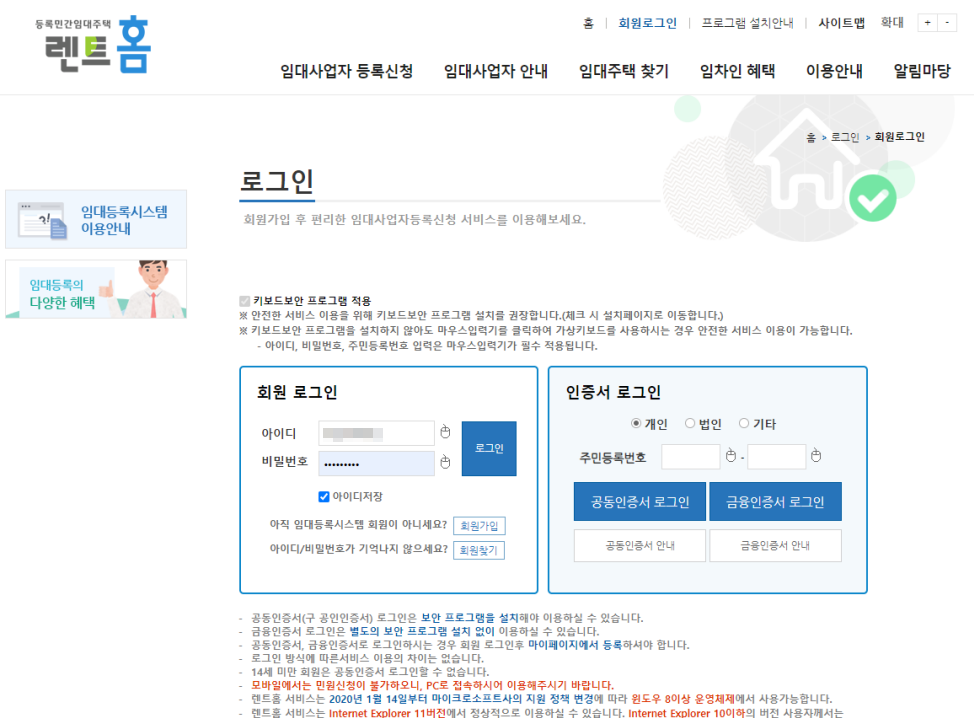 렌트홈(임대등록시스템) 접속