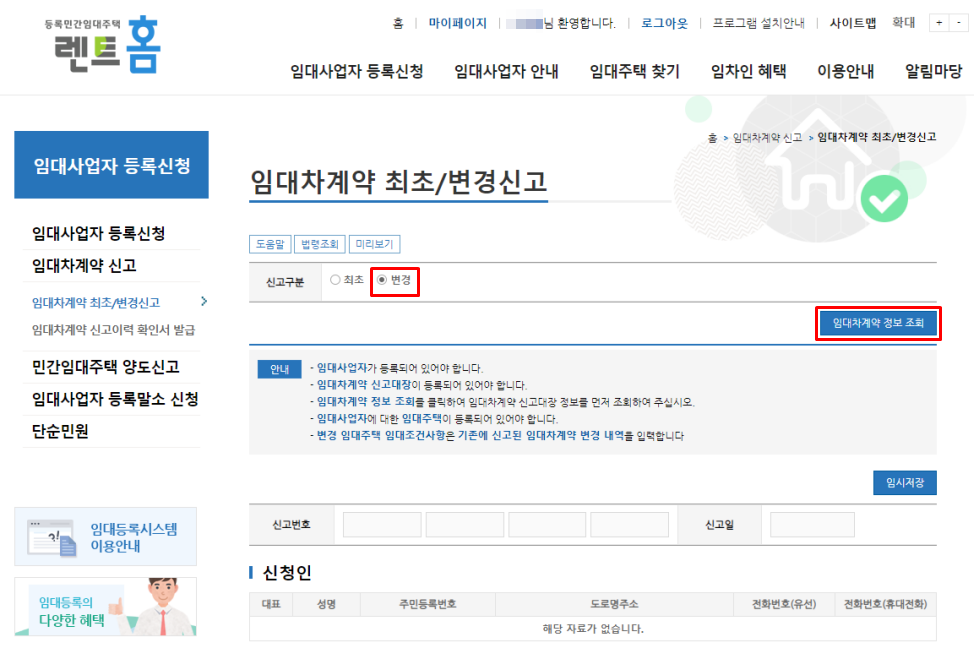 임대차 계약 정보조회를 클릭합니다.