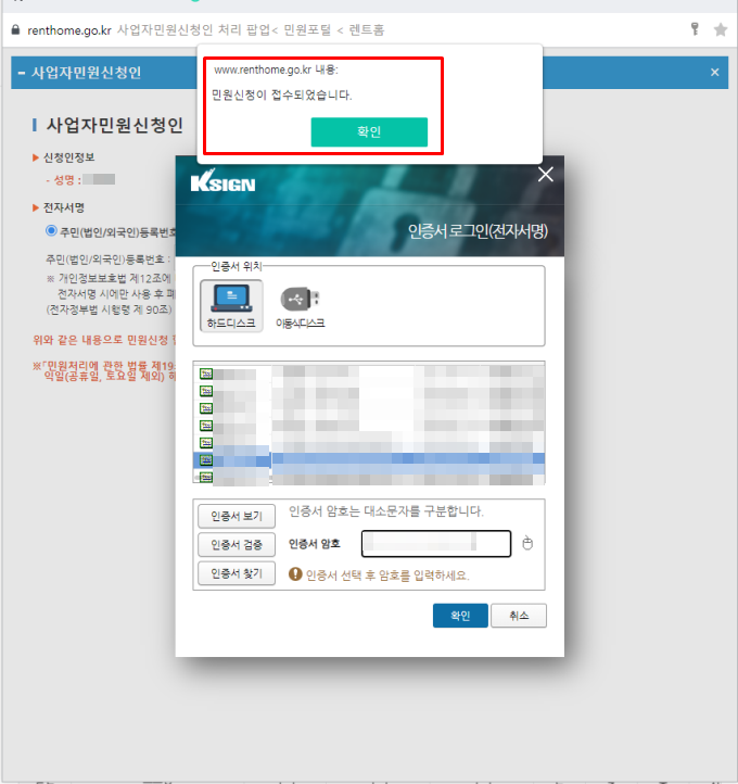 마지막으로 공인인증을 진행하면 민원 신청이 접수되며