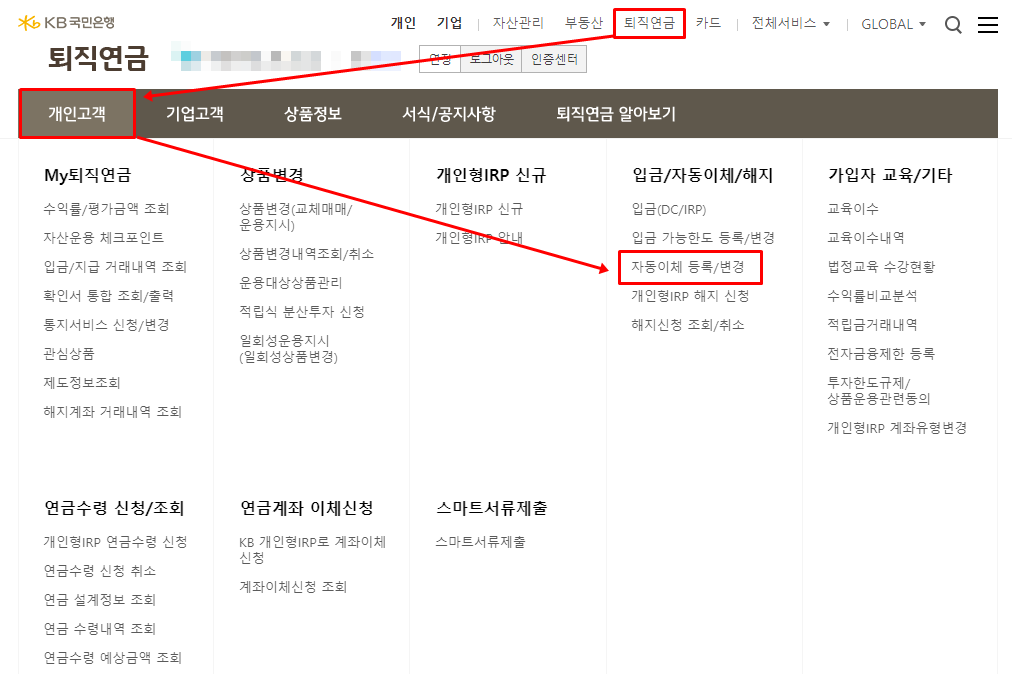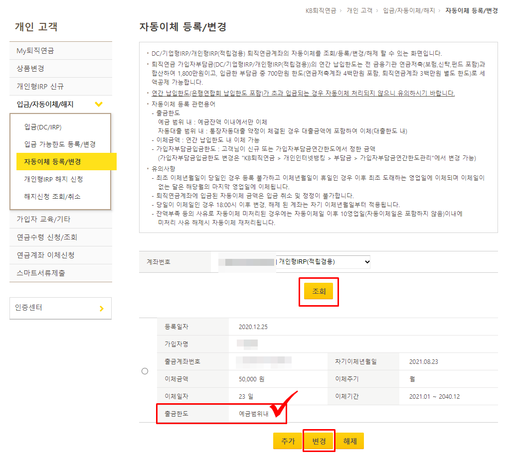 퇴직연금 → 개인고객 → 입금/자동이체/해지 → 자동이체 등록/변경