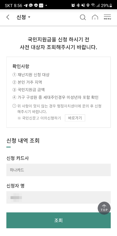 재난지원금 신청 결과 조회