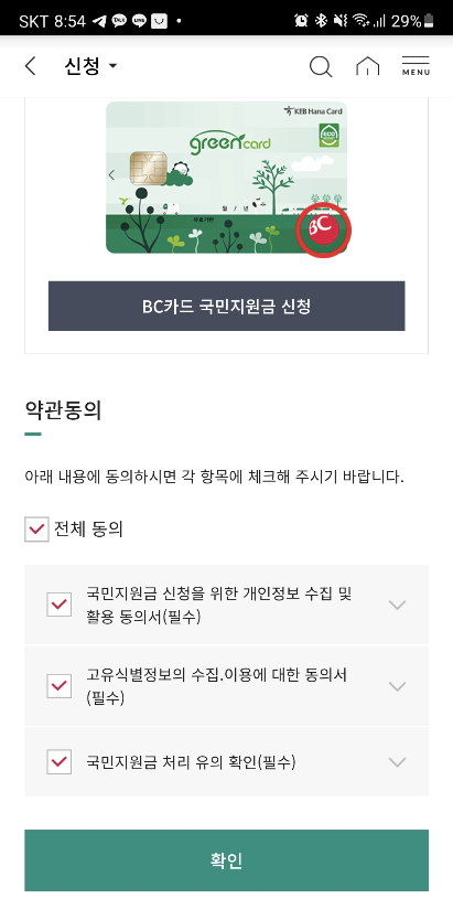 하나카드가 아닌 BC카드사로 별도 신청해야한다는 안내가 표기되구요