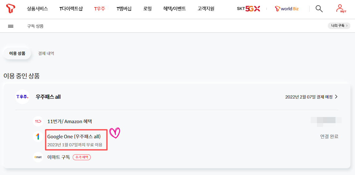 우주패스 등록 사항 확인은 Tworld에서 T우주 → 나의구독에서
