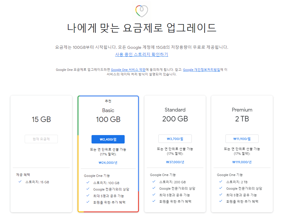 15GB 무료의 임계치에서 매달 2400원이면 100GB로 업그레이드할수 있는데