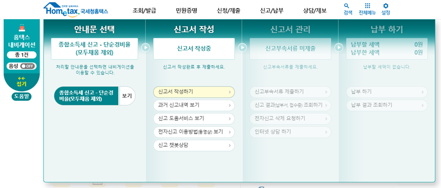 국세청홈택스에 로그인하여 신고/납부 → 종합소득세를 클릭합니다.