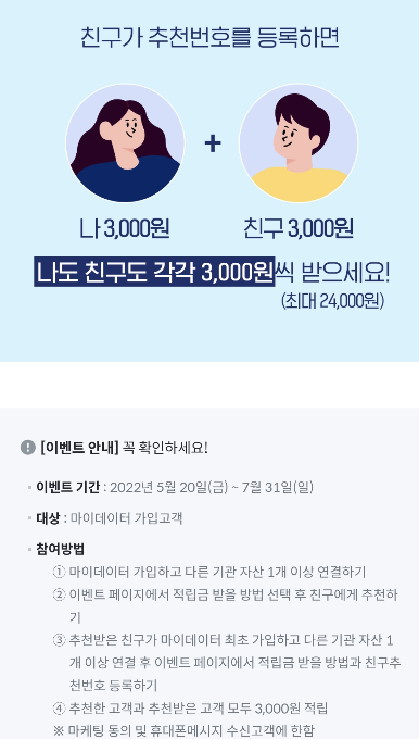 본인이 가입하고 자산을 1개 이상 연결하고 친구에게 추천하면