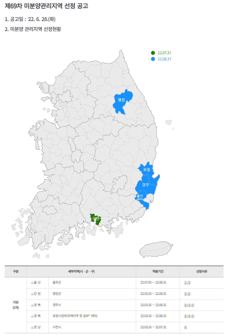이번 6월 발표에서는 울산 울주군이 신규로 들어오고 음성과 사천이 빠지게되었습니다.