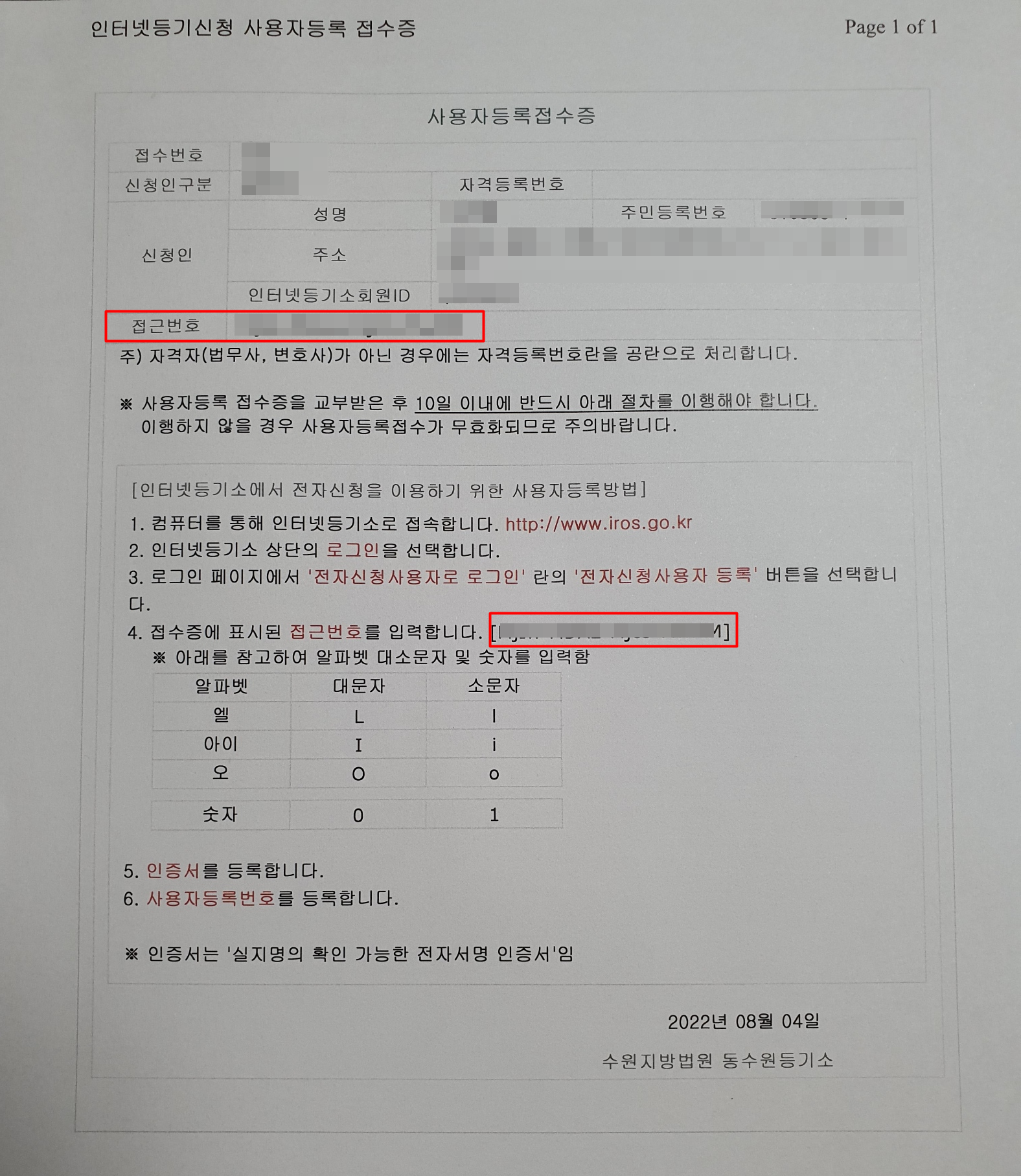 아래와 같은 사용자 등록 접수증을 받게됩니다.