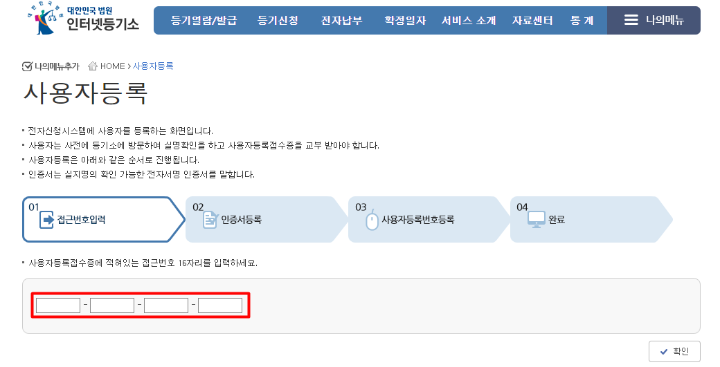 등기소에서 받은 접수증 서류의 16자리 접근번호를 차례로 입력합니다.