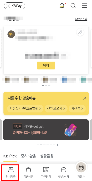 KB스타뱅킹에 로그인하여 하단의 전체계좌를 클릭합니다.