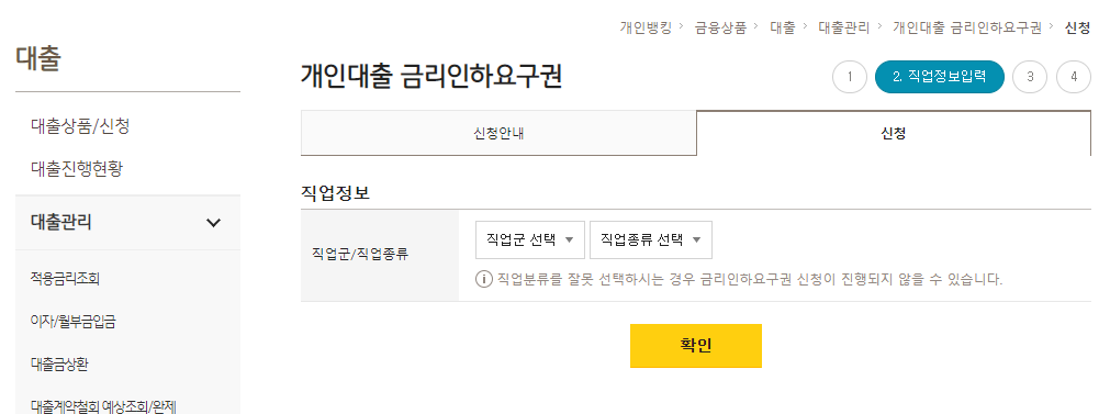 국민은행 웹 홈페이지 - 금리인하요구권 신청 방법