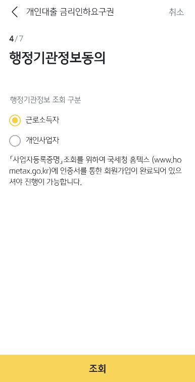 약관동의와 직업선택, 행정기관정보 동의후