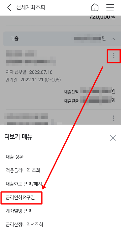 대출계좌로 이동하여 오른쪽 점세개 메뉴를 선택하여
