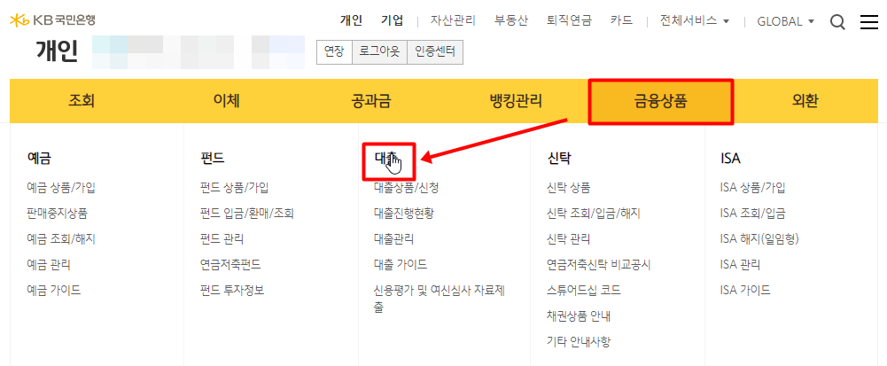 국민은행 홈페이지 로그인하여 금융상품 - 대출로 이동합니다.