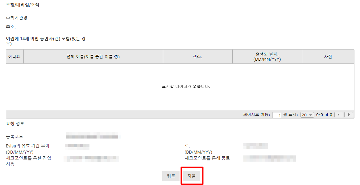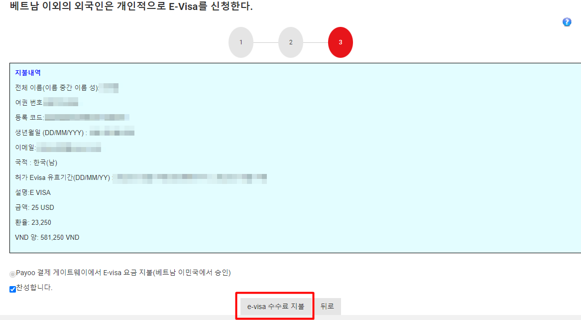 결제 하기전에 다시한번 정보 확인을 진행하며 동의후 E-VISA 수수료 지불을 클릭합니다.
