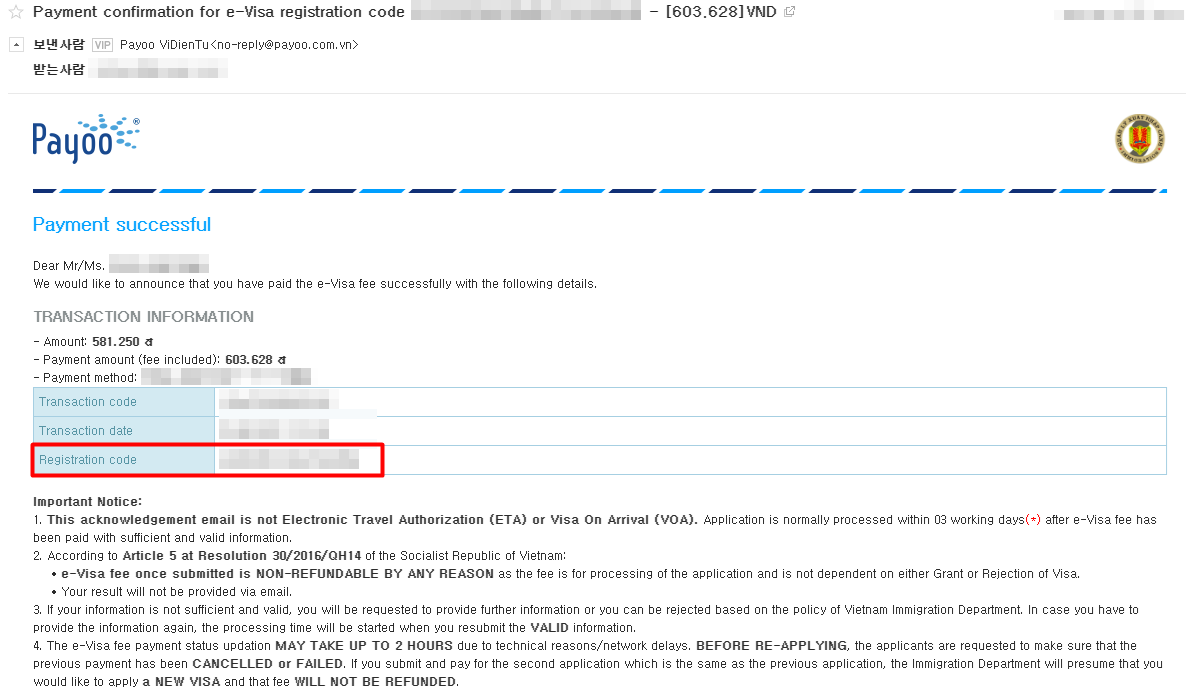 아래와 같이 결제 진행후 이메일에 비자 코드를 안내해줍니다.
