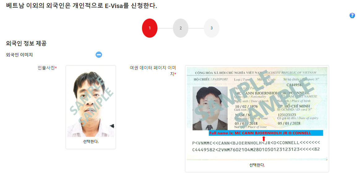 아래와 같이 여권사진과 여권 데이터 페이지 정보가 필요하며
