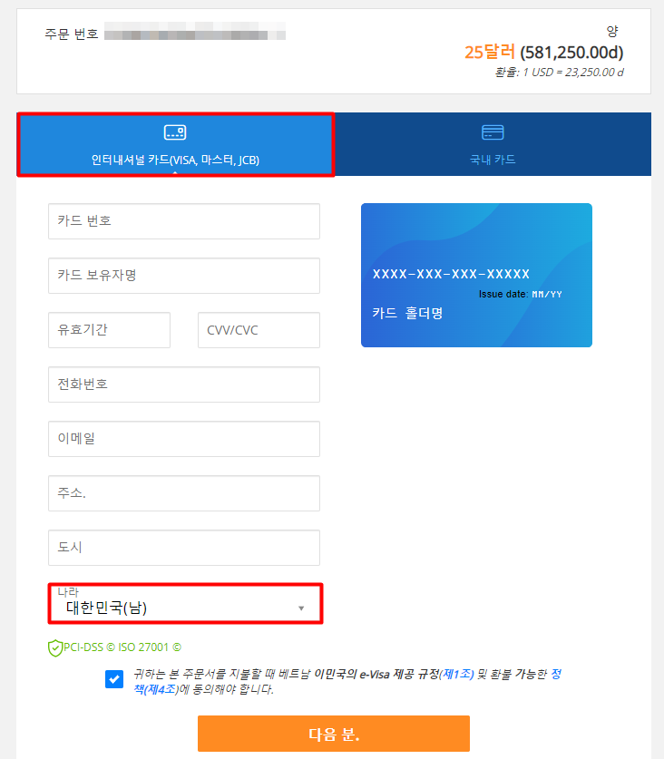 본인 카드 정보를 입력후 나라는 기본 베트남으로 되어있는데