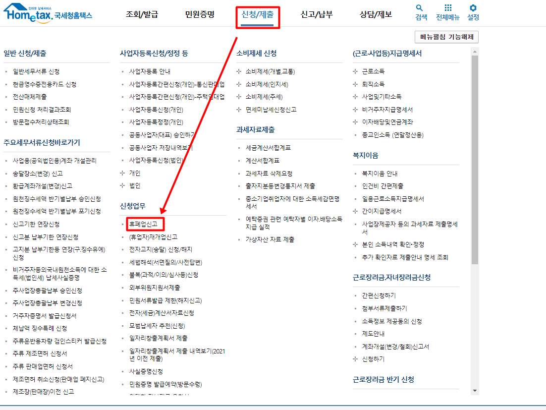 상단 메뉴의 신청/제출 - 신청업무 - 휴폐업신고로 이동합니다.