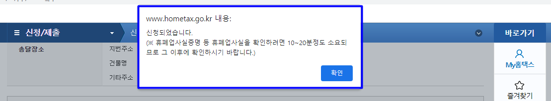 신청하기 와 확인만으로 폐업신고가 완료되었으며,