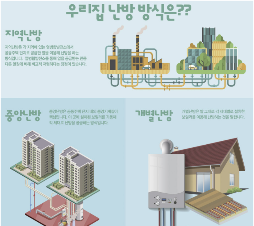 우선 난방비의 종류를 살펴보면 지역난방, 중앙난방, 개별난방으로 나눌수 있는데