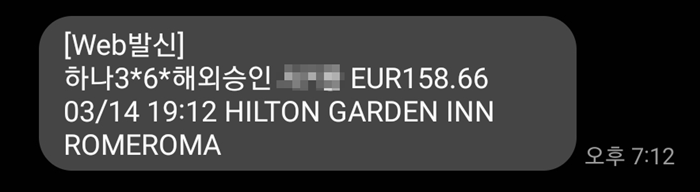 조금전 힐튼 가든인 로마 클라리지에서 결제 문자를 받고