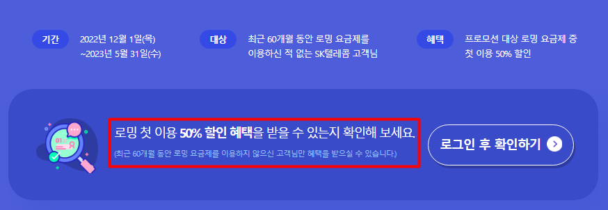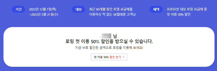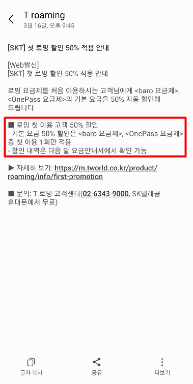 저는 로밍 첫 이용 50% 할인을 받을수 있다고하네요..ㅎ