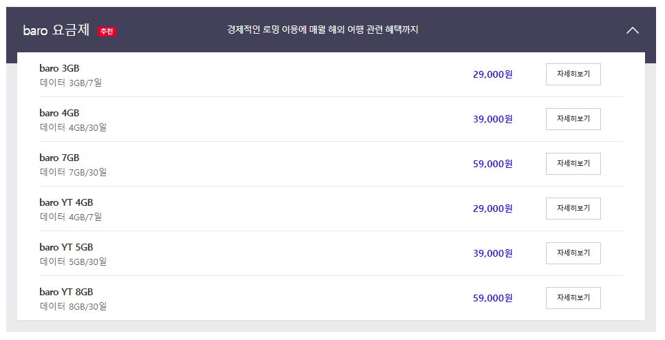 가입할수 있는 요금제로는 baro 요금제와 baro YT 요금제가 있구요